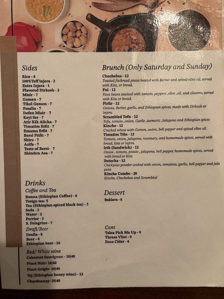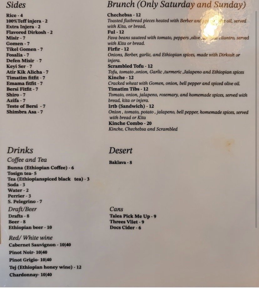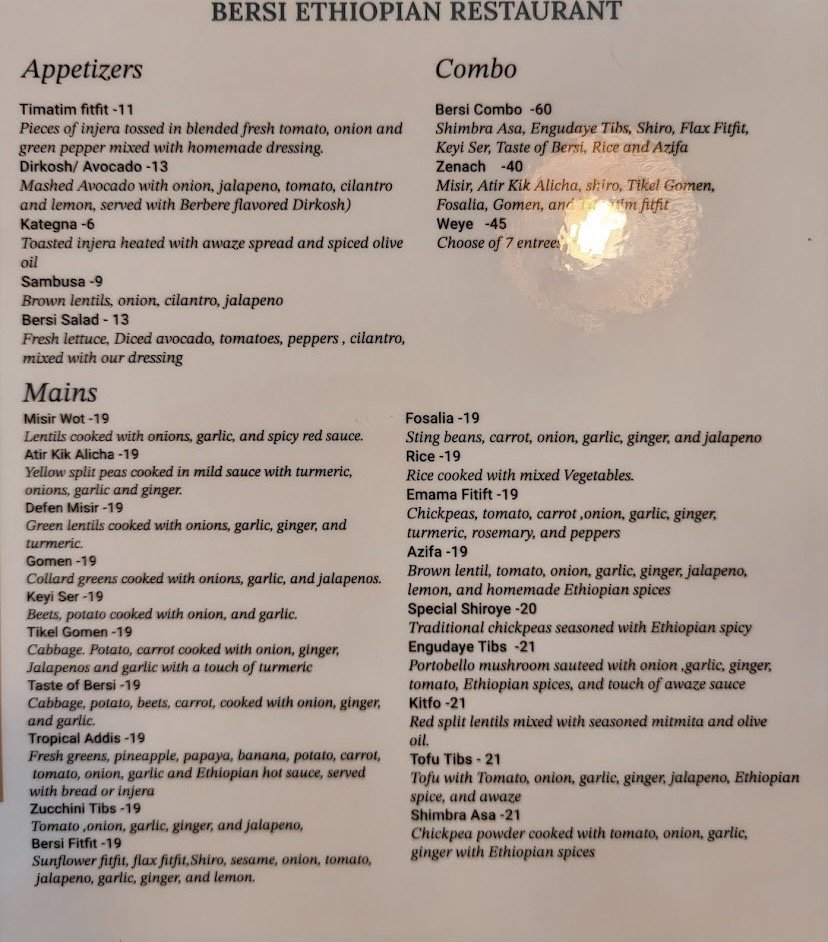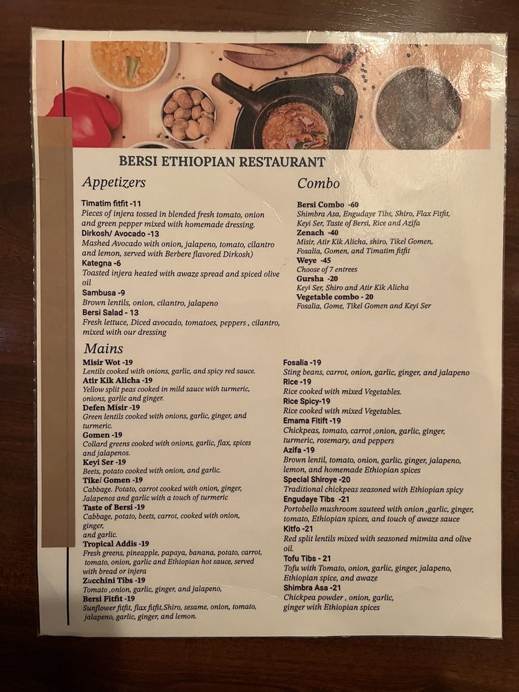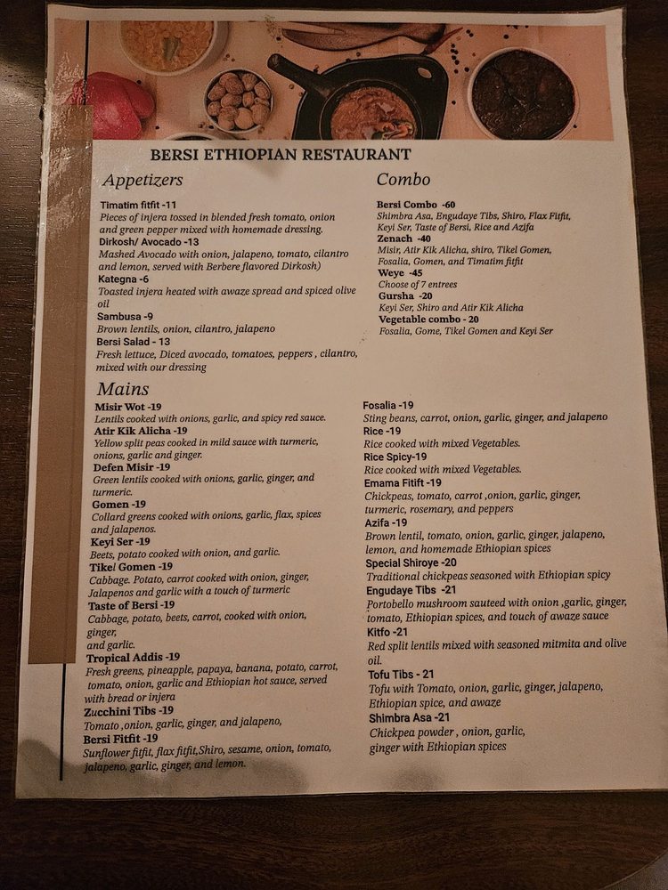 Bersi Ethiopian Restaurant, located in Brooklyn, NY, offers a delightful experience with its flavorful Ethiopian cuisine. The menu features a variety of options, including the popular Chechebsa Brunch, Bersi Salad, and Timatim Fitfit appetizer. Customers rave about the welcoming atmosphere and attentive staff, making it a great spot for solo dining or gathering with friends. The dishes are beautifully spiced, with fresh injera that complements the stews and veggies perfectly. Reviewers praise the generous portions, authentic flavors, and the availability of vegan options. Don't miss out on trying the vegetarian platter and Ethiopian beer. Bersi Ethiopian Restaurant is truly a hidden gem, where every bite is a taste of Ethiopia in a cozy setting.